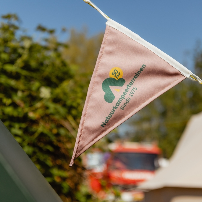 Je kent ze vast nog wel, de vaantjes voor boven op je tent. Dit vrolijke jubileumvaantje met ons speciale jubileumlogo, gemaakt van Rpet (gerecyclede petflessen), is er één om trots op te zijn. Ook te bestellen met stokje.